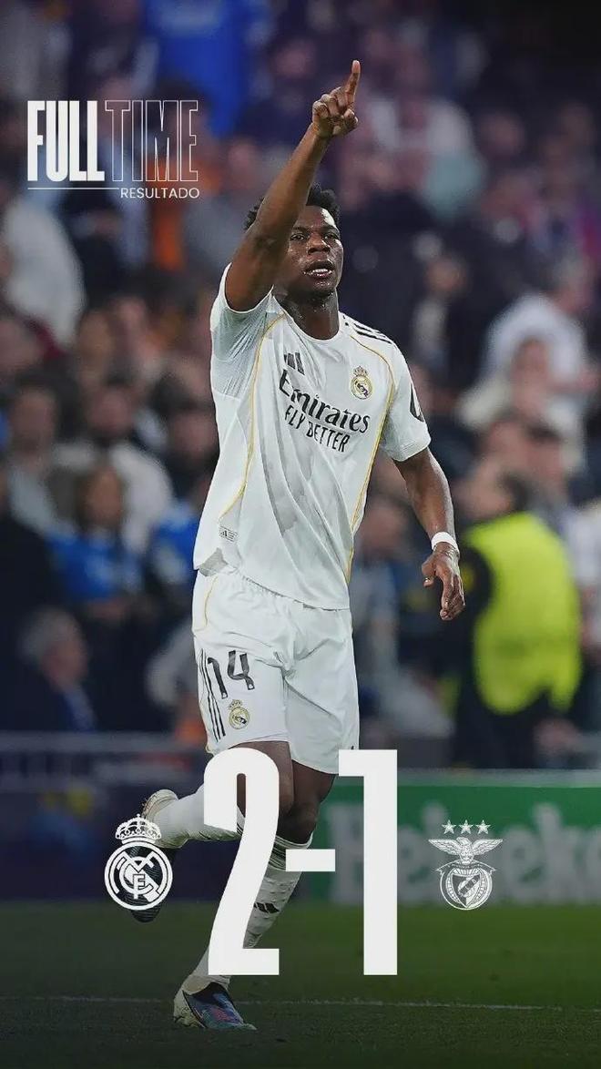伯纳乌的比分牌最终锁定在2-1,皇马总比分3-1淘汰本菲卡,连续23次杀入欧冠16强,创造了历史纪录。