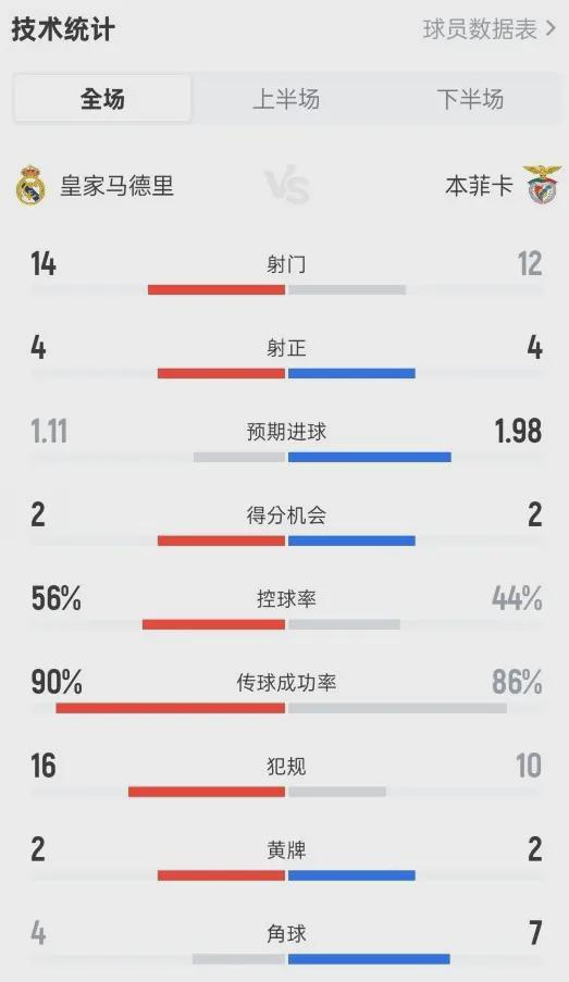 全场比赛,本菲卡的预期进球(xG)高达1.98,而皇马只有1.11。本菲卡创造了更多的绝佳机会,射门数12-14并不落下风,甚至在第60分钟由拉法·席尔瓦完成了一脚击中横梁的射门——如果这球进了,皇马大概率已经回家钓鱼了。