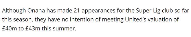 特拉布宗体育高层透露,曼联为本赛季租借到该队的门将安德烈·奥纳纳标价4500万欧元到5000万欧元(4000万~4300万英镑)高价,因此他们今夏不会买断他,奥纳纳将会在7月份重返红魔。